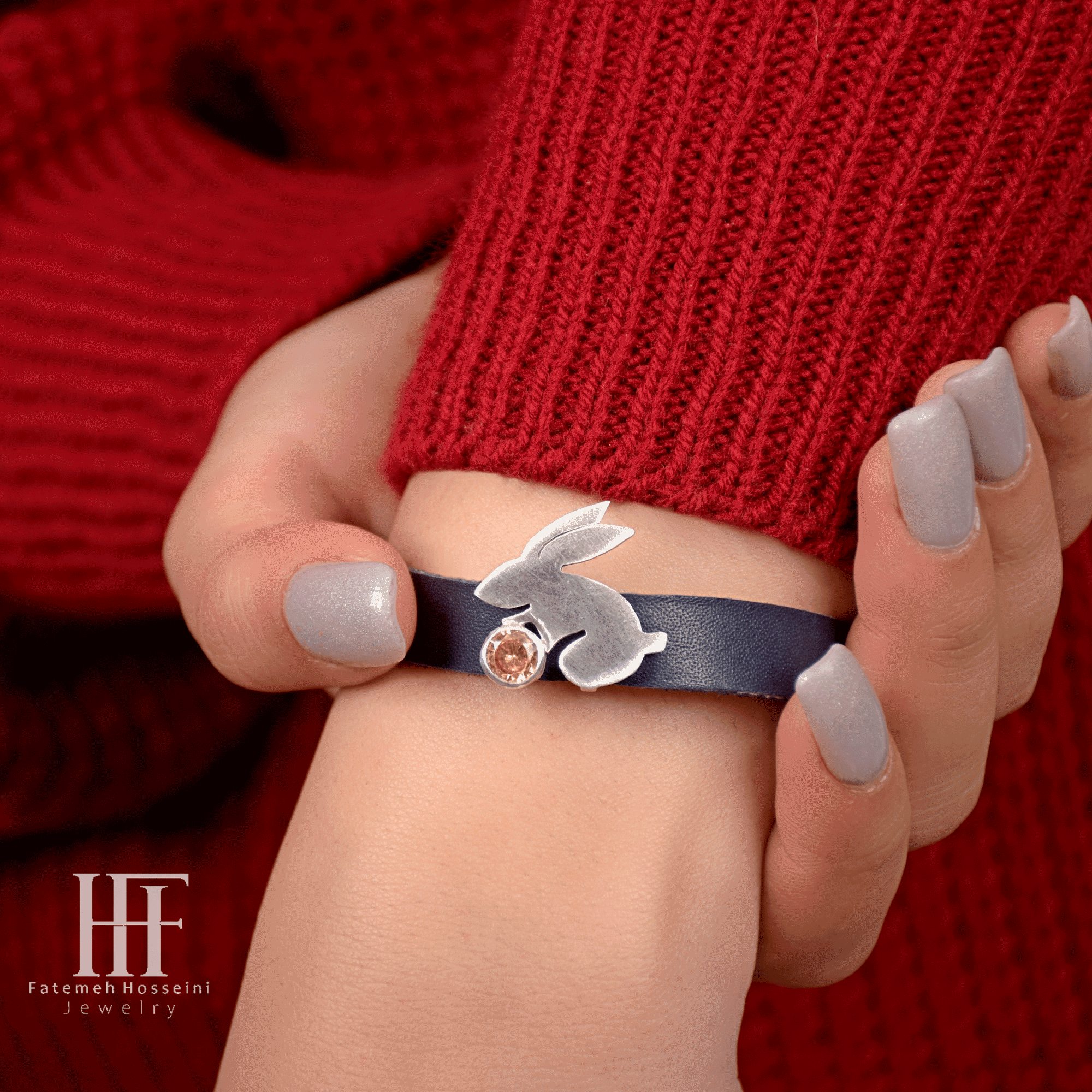 این طرح دارای بند چرمی و یک پلاک طرح خرگوش به همراه نگین است .